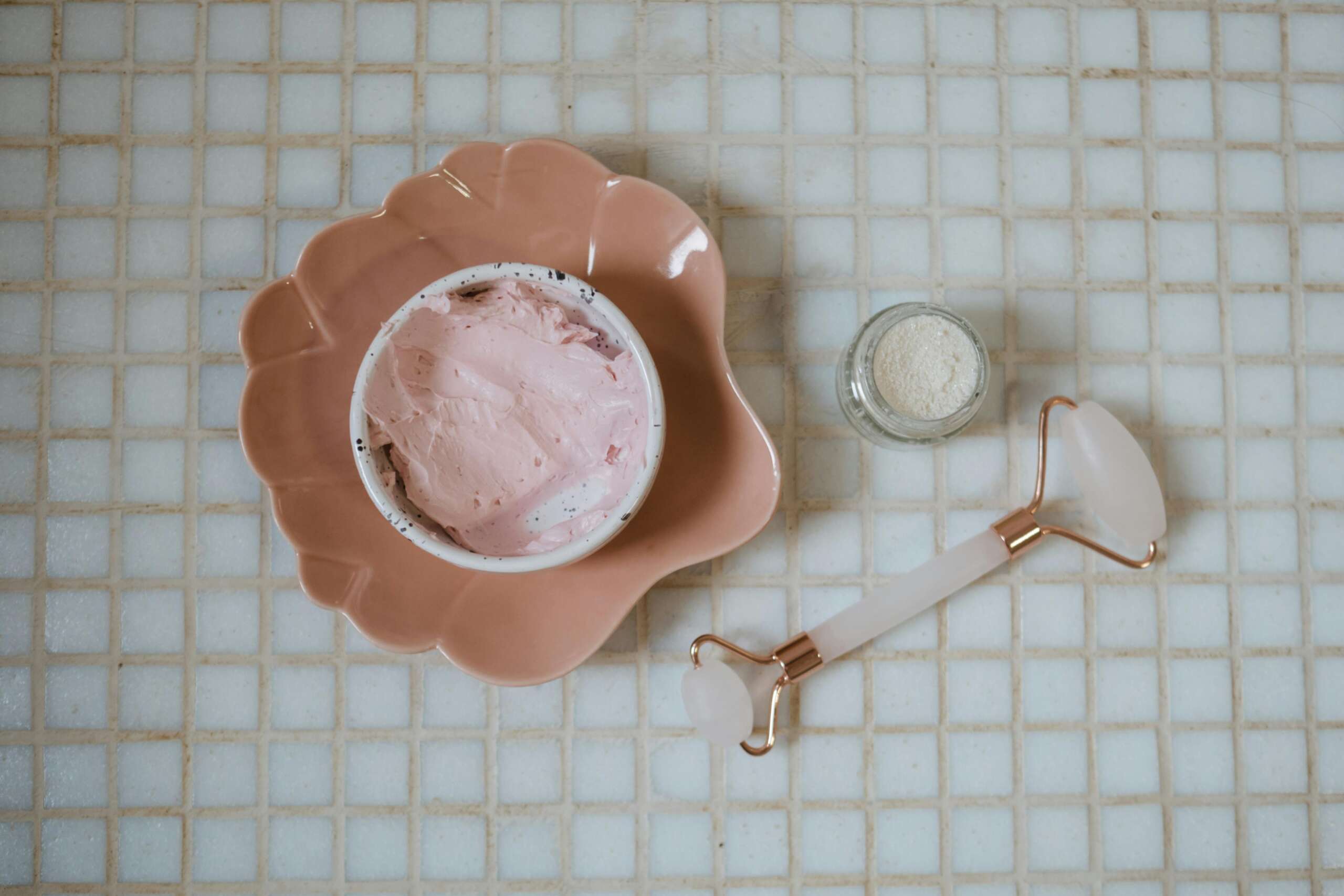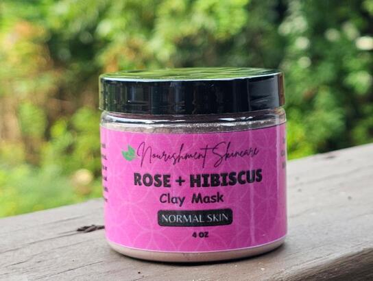 Rose + Hibiscus Ingredients: Kaolin Clay, French Rose Clay, Rose Petal Powder, Organic Hibiscus Powder, Organic Rose Geranium Essential Oil