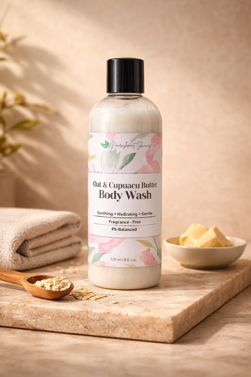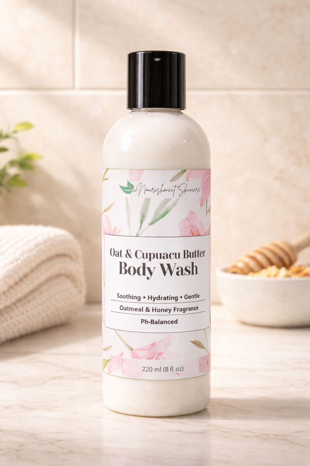 Oat & Cupuaçu Butter Body Wash a gentle, pH‑balanced cleanser formulated for dry, sensitive, and problem‑prone skin. Mild surfactants cleanse without stripping while hyaluronic acid, glycerin and sodium lactate deliver lasting hydration. Niacinamide and panthenol support barrier repair and reduce irritation, and oat oil plus cupuaçu butter replenish lipids to soothe and soften skin. Raw honey and organic aloe provide calming and conditioning benefits. Comes packaged in an 8 fl oz bottle. Available unscented or lightly scented with Crunchy Granola: fresh oats, golden honey & vanilla bean.