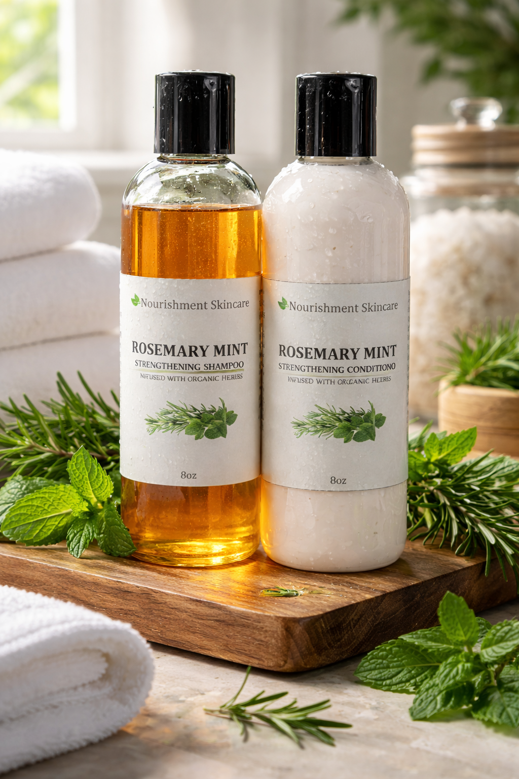 Our Rosemary Mint Shampoo and Conditioner Set is a thoughtfully crafted, made-to-order product designed to nurture both your hair and scalp. Each set comes packaged in an eco-friendly 8 oz bottle and is pH balanced to provide optimal results for various hair types.